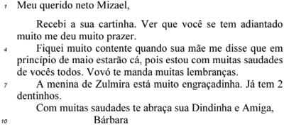 Carta de Bárbara ao neto Mizael (carta de 1883). Corpus Compartilhado Diacrônico: cartas pessoais brasileiras. Rio de Janeiro: Universidade Federal do Rio de Janeiro, Faculdade de Letras. Internet: <www.tycho.iel.unicamp.br> (com adaptações).