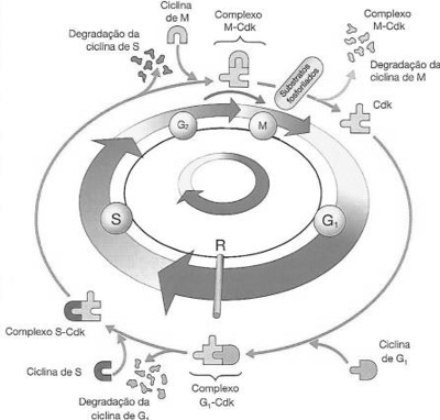 Com função determinante no controle do ciclo celular, foi isolada e caracterizada uma família de enzimas quinases de proteínas, denominadas de quinases dependentes de ciclina ou da sigla em inglês CDK. Uma quinase de proteína tem como atividade básica a fosforilação de proteína-substrato, o que consiste em transferir um grupo fosfato do doador ATP ou GTP para aminoácidos aceptores desse fosfato, como serinas ou treoninas. As CDK são ativadas e inativadas ao longo ciclo, promovendo, em consequência, padrões cíclicos de fosforilação de proteínas que desencadeiam ou regulam os principais eventos do ciclo.
