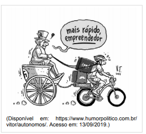 Na charge, o trabalhador é visto como peça-chave dos empreendimentos e da inovação, impulsionando um sistema dinâmico e flexível de trabalho.