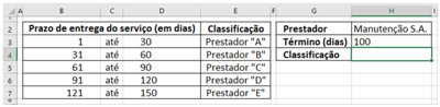Escolha a alternativa CORRETA, que corresponde ao resultado que será exibido na célula H4, após o usuário apertar a tecla ENTER tendo inserido nessa mesma célula o seguinte conteúdo: =PROCV($H$3;$B$3:$E$7;4;1).