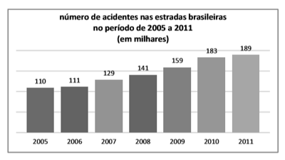 Considere que, em 2009, tenha sido construído um modelo linear para a previsão de valores futuros do número de acidentes ocorridos nas estradas brasileiras. Nesse sentido, suponha que o número de acidentes no ano t seja representado pela função F(t) = At + B, tal que F(2007) = 129.000 e F(2009) =159.000. Com base nessas informações e no gráfico apresentado, julgue o item a seguir.