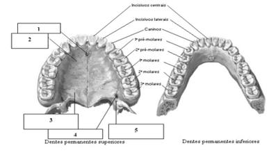 1-Fossa incisiva, 2- Lamina palatina do maxilar, 3-placa horizontal do osso palatino, 4-forame palatino maior e 5-forame palatino menor.