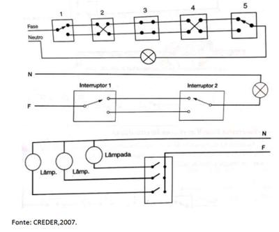 Interruptores são dispositivos de comando dos circuitos. Os interruptores de várias seções são usados para comandar diversas lâmpadas no mesmo ponto de luz. O interruptor paralelo é usado quando se quer apagar ou acender as luzes de pontos diferentes. O interruptor intermediário quando se há a necessidade de comandar o circuito em vários pontos diferentes. Abaixo, apresentam-se as representações esquemáticas destes 3 (três) tipos de circuitos, identifique a ordem apresentada.