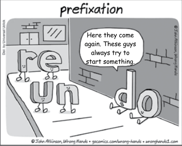 This cartoon can be used as a resource to teach or review the use of prefixes in the English language. You may offer your students the following words and ask them to choose the alternative in which the prefix has the same meaning as “un”. Your students should mark alternative