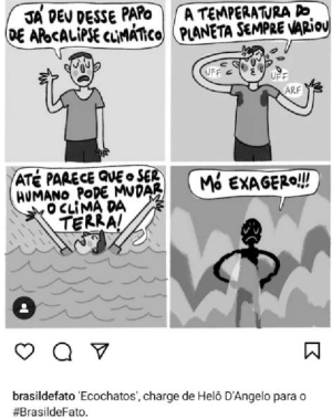 Analise a tirinha "Ecochatos" e identifique a classificação da frase presente no segundo quadrinho, em que a personagem diz: "A temperatura do planeta sempre variou".