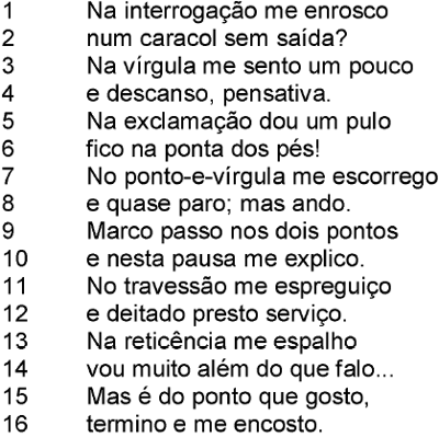 O poema é construído a partir de referências aos sinais de pontuação e ao papel que eles exercem nos enunciados escritos. Analise as alternativas abaixo e assinale a CORRETA: