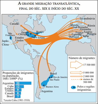 Observe atentamente o mapa abaixo e responda à questão proposta sobre as correntes migratórias da Europa para a América no final do século XIX e início do XX.