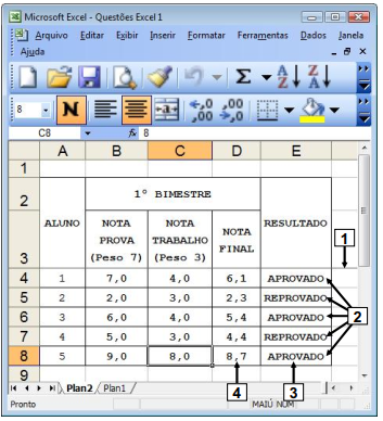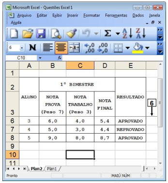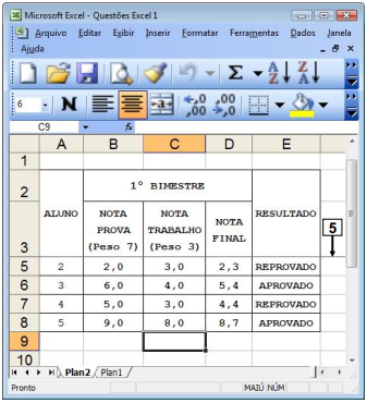 Na janela principal do Excel 2003, mostrada na Figura 6(a), construiu-se uma tabela para calcular e apresentar a nota final e o resultado obtido pelos alunos em uma disciplina. Nas células apontadas pela seta nº 2 (Figura 6(a)), o Excel 2003 apresentará, a palavra "APROVADO" ou "REPROVADO", dependendo da nota final obtida pelo aluno: se a nota final for maior ou igual a 5,0 (cinco) será mostrada a palavra "APROVADO", caso contrário será mostrada a palavra "REPROVADO". Nesse caso, para que fosse exibida a palavra "APROVADO", no local apontado pela seta nº 3, bastou inserir, nesse local, a seguinte fórmula: