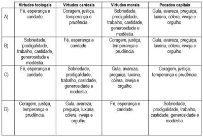 Quando examinamos as virtudes (teologais, cardeais e morais) e os pecados (capitais) definidos pelo cristianismo, descobrimos que as suas correspondentes características mais relevantes estão (no quadro abaixo) corretas em: