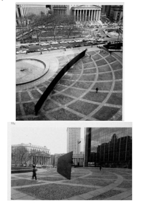 Richard Serra é um escultor norte-americano que em 1981 instalou a obra Tilted Arc (Arco Inclinado), um arco ligeiramente curvado, com 3,5 metros de altura, na Federal Plaza (Nova Iorque). A polêmica gerada ao redor desta obra, que acabou sendo removida a despeito do autor, trouxe à tona a relação entre a obra e o espaço físico que a acolhe no campo da Arte Pública.