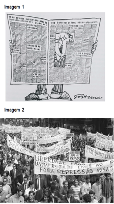 As duas imagens abordam temas ligados à ditadura civil-militar no Brasil (1964-1985), e sobre ambas as imagens, é correto afirmar que: