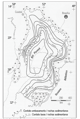 A Figura acima representa um mapa de isópacas cumulativas (equidistância entre as curvas de 500 metros) de rochas sedimentares sotopostas aos derrames basálticos da bacia do Paraná, onde se verifica que a