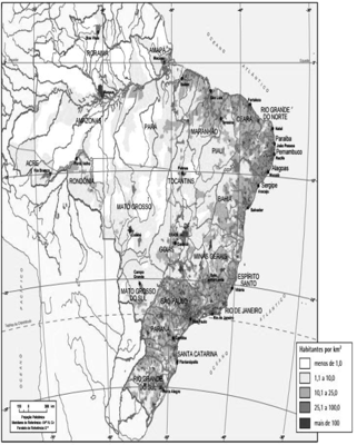 Um Brasil povoado no litoral e vazio no interior é o que mostra o mapa de Densidade Demográfica de 2010, uma imagem detalhada da distribuição espacial da população brasileira no território nacional, a partir dos resultados do Censo Demográfico 2010. Ele revela as enormes diferenças encontradas nas formas de povoamento do país.
