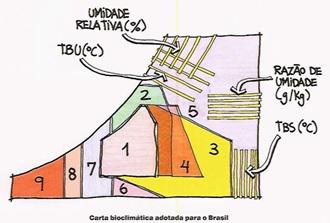 De acordo com LAMBERTS, DUTRA e PEREIRA, Givoni concebeu uma carta bioclimática para edifícios. A carta baseia-se em temperaturas internas de edifícios propondo estratégias construtivas para adequação da arquitetura ao clima. Com base em análises, concluiu-se que o trabalho de Givoni de 1992 para países em desenvolvimento é o mais adequado às condições brasileiras. A carta, na figura abaixo, é construída sobre o diagrama psicométrico, que relaciona a temperatura do ar e a umidade relativa e identifica nove zonas de atuação. Com base na imagem abaixo, analisar os itens que seguem:
