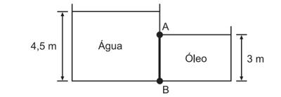 A figura apresenta uma comporta AB com 2 metros de largura e 3 metros de altura, que separa dois tanques de seções retangulares. O tanque à esquerda contém água (γÁGUA = 10 kN/m³), e o da esquerda, óleo (γÓLEO = 8 kN/m³).