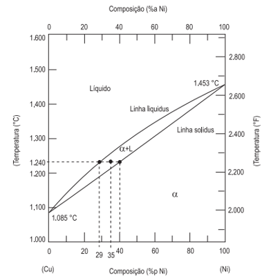 A figura abaixo apresenta o diagrama de fases em condições de equilíbrio para o cobre e o níquel.