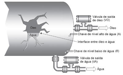 A figura acima apresenta um separador atmosférico de óleo e água, com duas válvulas (on/off) normalmente fechadas e duas chaves de nível (on/off) normalmente abertas. Caso o nível de água atinja a chave de nível alto de água, a válvula de saída de água deverá se abrir e a válvula de saída de óleo, fechar-se. Por outro lado, caso o nível de água esteja inferior à chave de nível baixo de água, a válvula de saída de água deverá se fechar e a válvula de saída de óleo, abrir-se. Qual programa, em lista de instruções, corresponde a este sistema?