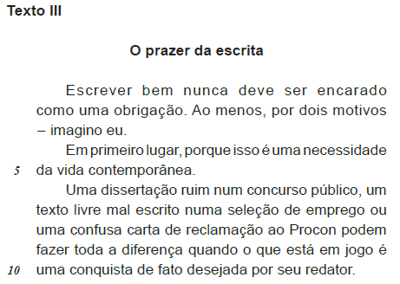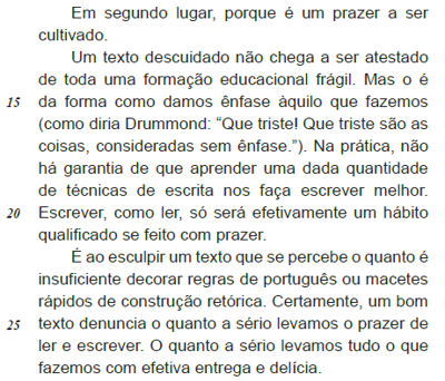 Na prática, não há garantia de que aprender uma dada quantidade de técnicas de escrita nos faça escrever melhor. Escrever, como ler, só será efetivamente um hábito qualificado se feito com prazer. (l. 17-21, Texto III)