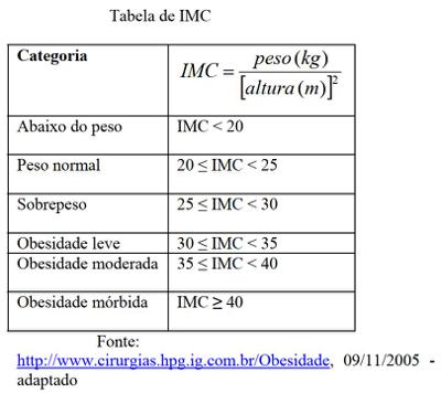 O cálculo do índice de massa corporal (IMC) de uma pessoa permite situá-la em diferentes categorias de peso. Veja a tabela: