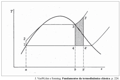 O ciclo de funcionamento ideal de uma máquina térmica é o ciclo de Carnot. Na prática, entretanto, o ciclo que mais se aproxima dessas condições é o ciclo de Rankine, que constitui o ciclo de funcionamento das instalações térmicas a vapor d’água. A figura acima mostra o efeito do superaquecimento do vapor na caldeira sobre o rendimento do ciclo de Rankine. Na figura, pode-se observar que, com o superaquecimento, o trabalho aumenta o equivalente à área 3-3'-4'-4-3, enquanto o calor transmitido na caldeira aumenta o equivalente à área 3-3'-b'-b-3.