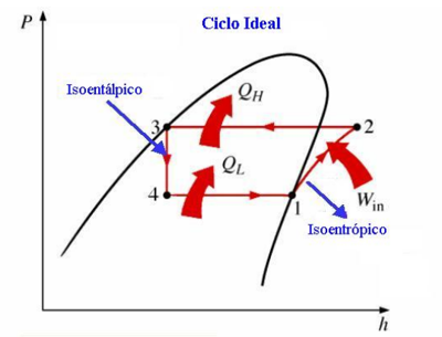 Os ciclos de refrigeração, isto é, ciclos termodinâmicos de fluidos refrigerantes em equipamentos frigoríficos por compressão de vapor, são adequadamente representados em diagramas P x h (pressão-entalpia, diagrama de Mollier). A Figura abaixo traz a representação esquemática do ciclo ideal de refrigeração por compressão de vapor no diagrama de Mollier