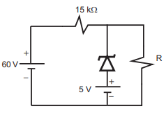 No circuito da figura acima, o Diodo Zener é considerado ideal e opera, em sua região ativa, com tensão nominal de 16 V. Qual o valor do resistor R, em k𝛀, para que a corrente no Zener seja de 2 mA?