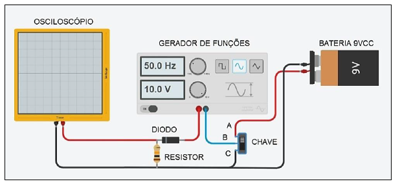 “O circuito foi montado em uma bancada de uma oficina de manutenção, onde um gerador de sinais, ligado na opção de onda senoidal, gerando valor de tensão de pico a pico (Vpp = 10 V) junto com uma bateria de 9 V de corrente contínua alimentam um circuito composto de um diodo retificador de silício de uso comum, um resistor de 10 KOhms e uma chave comutadora de três terminais (A, B e C), cujas saídas do circuito (terminais do resistor) são ligadas em um osciloscópio.”
