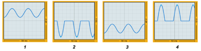 As imagens do osciloscópio, quando o circuito estiver alimentado com a chave comutadora na posição A-B e, depois, na posição BC, são, respectivamente: