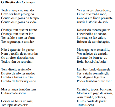 O conto de Ruth Rocha “O Direito das crianças”, abaixo, é a referência para responder esta questão. Assinale a alternativa CORRETA.