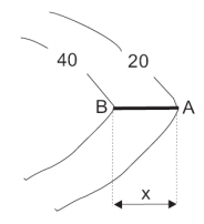 O croqui de um trecho de uma planta topográfica é apresentado na Figura 4. Nela se encontram representadas duas curvas de nível, cujos valores de altitude estão expressos em metros. A escala da planta topográfica é de 1:1.000 e a distância “x”, medida em planta, tem o valor de 2 cm.