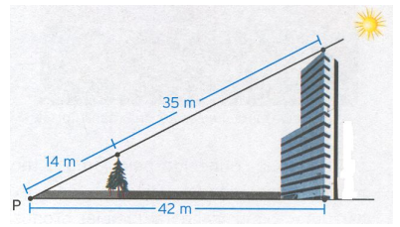 Em determinada hora do dia, a sombra de um edifício e a de uma árvore próxima apresentam-se como mostra a figura abaixo, ambas chegam até o ponto P. A que distância do edifício está a árvore?