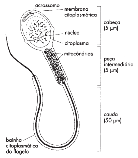 O esquema abaixo representa um espermatozóide humano, com suas respectivas regiões morfológicas.