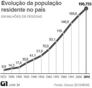 O gráfico a seguir mostra o crescimento da população brasileira. “A população brasileira cresceu, em 138 anos, quase 20 vezes, segundo apontam os resultados do Censo Demográfico 2010, do Instituto Brasileiro de Geografia e Estatística (IBGE). Em 2010, atingimos a marca de 190.755.799 habitantes.” Trecho tirado de uma materia feita por Carolina Lauriano e Nathália Duarte do g1.com.br.