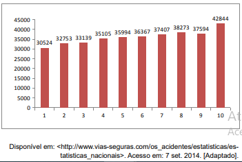 O gráfico a seguir apresenta a quantidade de óbitos em acidentes de trânsito registrados, em certa região, entre os anos de 2001 a 2010, representados no gráfico pelos números de 1 a 10.