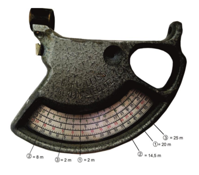 A figura do hipsômetro abaixo mostra as leituras (1, 2 e 3) que correspondem às medições de altura de 3 árvores (h1, h2 e h3), obtidas a uma distância de 20 m.