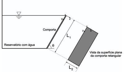 A Figura abaixo ilustra uma comporta retangular de comprimento L₁ e largura L₂ (perpendicular ao plano do papel).
