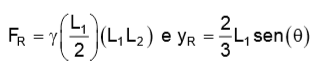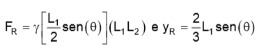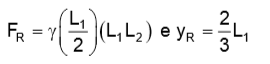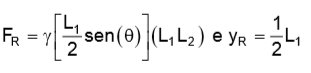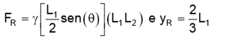 A expressão do módulo da força resultante, FR, com que a água, com peso específico ४, atua sobre a comporta, e a coordenada y do ponto de aplicação dessa força, em relação à superfície livre do fluido, YR, são, respectivamente: