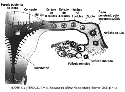 A figura abaixo ilustra a ovulação, fecundação e nidação (ou implantação) na espécie humana. Analise-o.