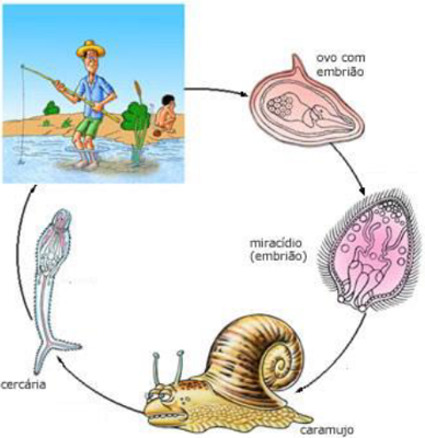 - ● Na água, a larva (miracídio) sai do ovo e entra no caramujo, cresce, vira cercária (forma que contamina as pessoas), sai do caramujo e entra na pele das pessoas que estiverem na água.