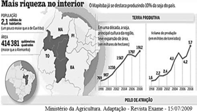 O interior nordestino é considerado como o lugar da seca, da terra inóspita e da miséria. Porém, surge, nesta sub-região, uma área que foi denominada pela população local de Mapitoba que, no cenário brasileiro atual, está sendo apresentada como uma das maiores potências do agronegócio. Observe as ilustrações e gráficos, a seguir: