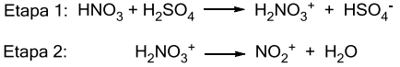 O íon nitrônio (NO₂⁺) é um importante intermediário formado em reações de nitração. É possível formar esse intermediário in situ através da reação entre ácido nítrico e ácido sulfúrico concentrados, de acordo com o mecanismo abaixo: