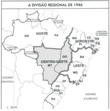 O mapa a seguir apresenta a divisão regional do Brasil, construída pelo IBGE, na década de 1940. A divisão regional atual, também realizada pelo IBGE, possui significativas mudanças. Atualmente, quantos estados formam a região Norte?