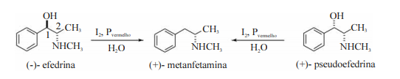 A metanfetanima, um psicoestimulante da classe das anfetaminas, é uma substância que gera alto potencial de dependência em seus usuários, em virtude de desencadear a liberação em cascata de dopamina no cérebro. Uma das rotas de síntese da (+)-metanfetamina está baseada na reação da (-)-efedrina ou (+)-pseudoefedrina com iodo molecular e fósforo vermelho em água, conforme ilustrado na equação química abaixo: