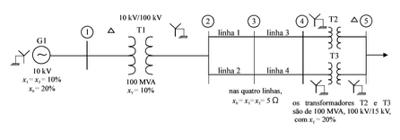 A figura acima mostra o diagrama unifilar de um sistema de potência com cinco barras, que contém os tipos de ligação dos transformadores e do gerador, bem como os dados de cada equipamento. O diagrama é utilizado com a finalidade de análise de faltas no sistema. Considere que as reatâncias de seqüência positiva e negativa do gerador sejam iguais. No caso dos demais equipamentos, para cada um deles, as reatâncias de seqüência positiva, negativa e zero são iguais. O sistema funciona com tensão nominal em todas as barras e as correntes de carga são desprezíveis, comparadas às correntes de defeito. Todos os equipamentos são representados somente por suas reatâncias, para efeito de construção dos diagramas de impedância