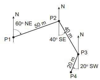 A poligonal aberta P1P2P3P4 esquematiza o rumo do eixo de uma faixa de dutos que será implantada. Conferindo a implantação, foi feita uma visada de ré de P3 para P2.