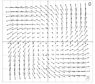 Um professor de física em uma aula de eletromagnetismo usa um visualizador de campos vetoriais para explorar a forma possível de campos elétricos gerados por distribuições de cargas estáticas de acordo com o eletromagnetismo, as unidades de escala não são relevantes.