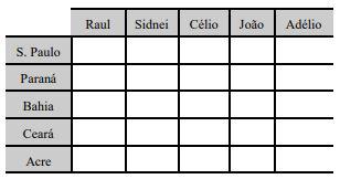 Raul, Sidnei, Célio, João e Adélio, agentes administrativos do MS, nascidos em diferentes unidades da Federação: São Paulo, Paraná, Bahia, Ceará e Acre, participaram, no último final de semana, de uma reunião em Brasília – DF, para discutir projetos do MS. Raul, Célio e o paulista não conhecem nada de contabilidade; o paranaense foi almoçar com Adélio; Raul, Célio e João fizeram duras críticas às opiniões do baiano; o cearense, Célio, João e Sidnei comeram um lauto churrasco no jantar, e o paranaense preferiu fazer apenas um lanche.
