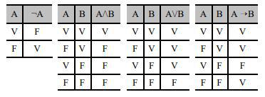 Para determinar a valoração (V ou F) de uma proposição composta, conhecidas as valorações das proposições simples que as compõem, usam-se as tabelas abaixo, denominadas tabelas verdade.