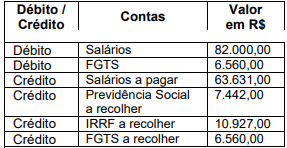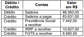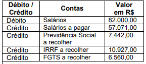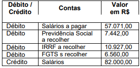 Assinale a alternativa CORRETA relativa aos lançamentos contábeis da apropriação do custo / despesa da folha de pagamentos da empresa ABC Ltda, no último dia do mês, pelo regime de competência: