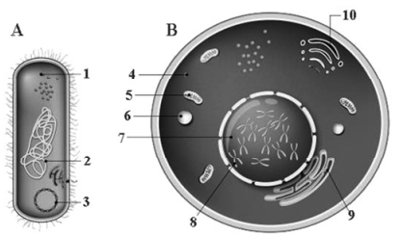 Considerando os esquemas A e B da figura apresentada e as principais características das células procarióticas e eucarióticas, julgue o item a seguir.